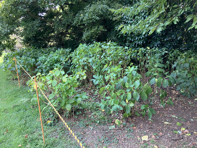 花柄を摘み、古い枝を切り、手前から奥に向かって高くなるように剪定したアジサイ