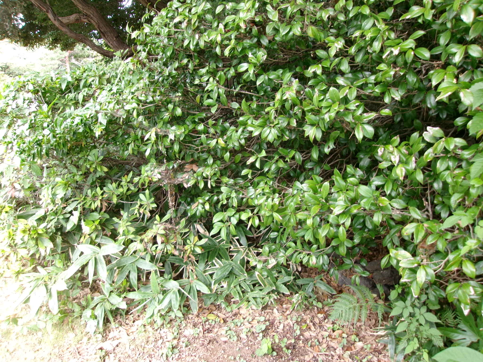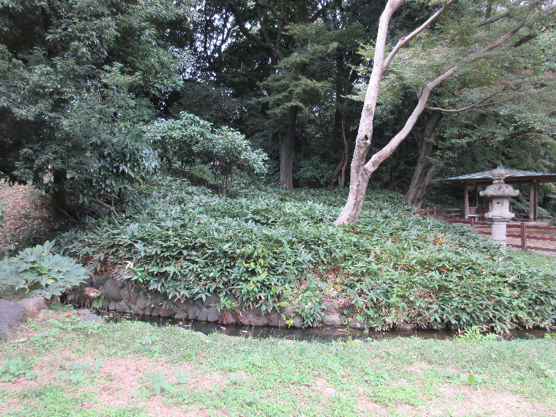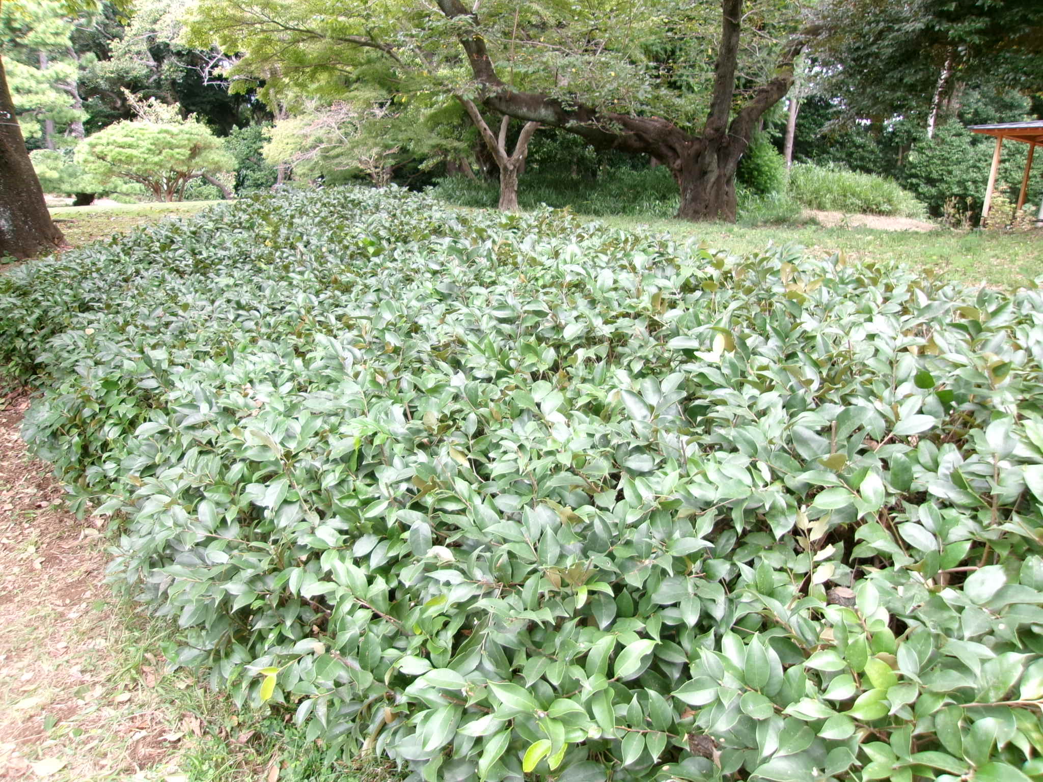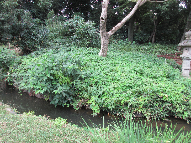 ツバキによって水路が見えなくなっている