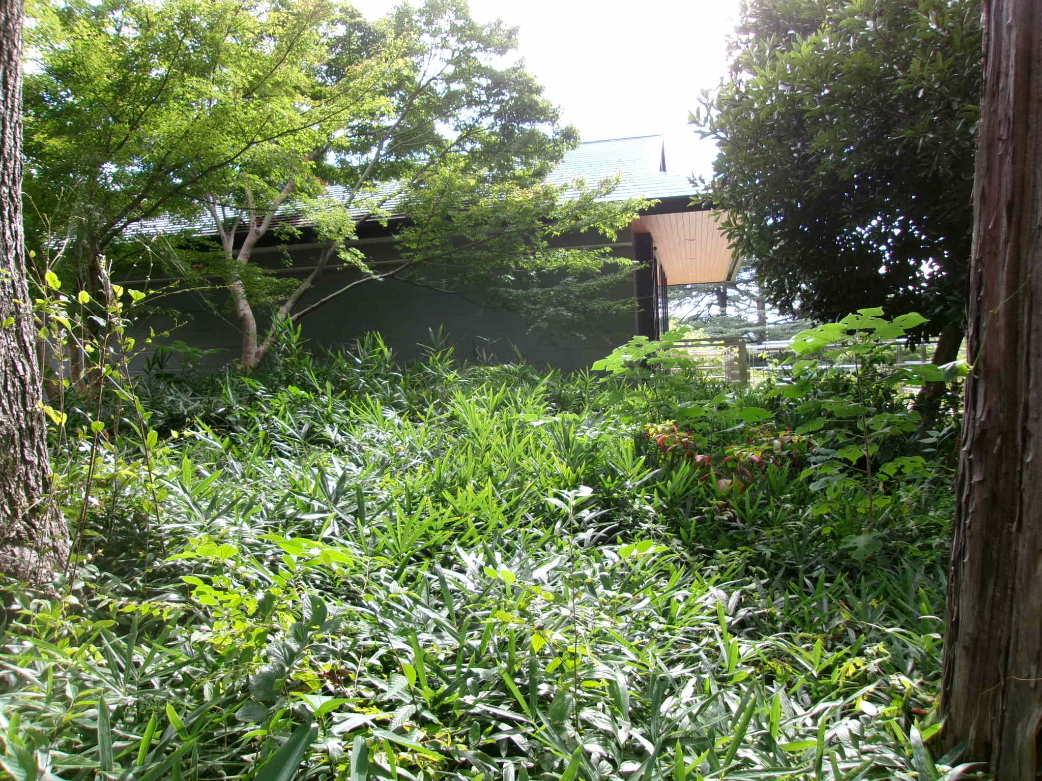 ヤブカラシやカラスウリなどが覆い、ところどころ実生木が伸びている四阿周辺