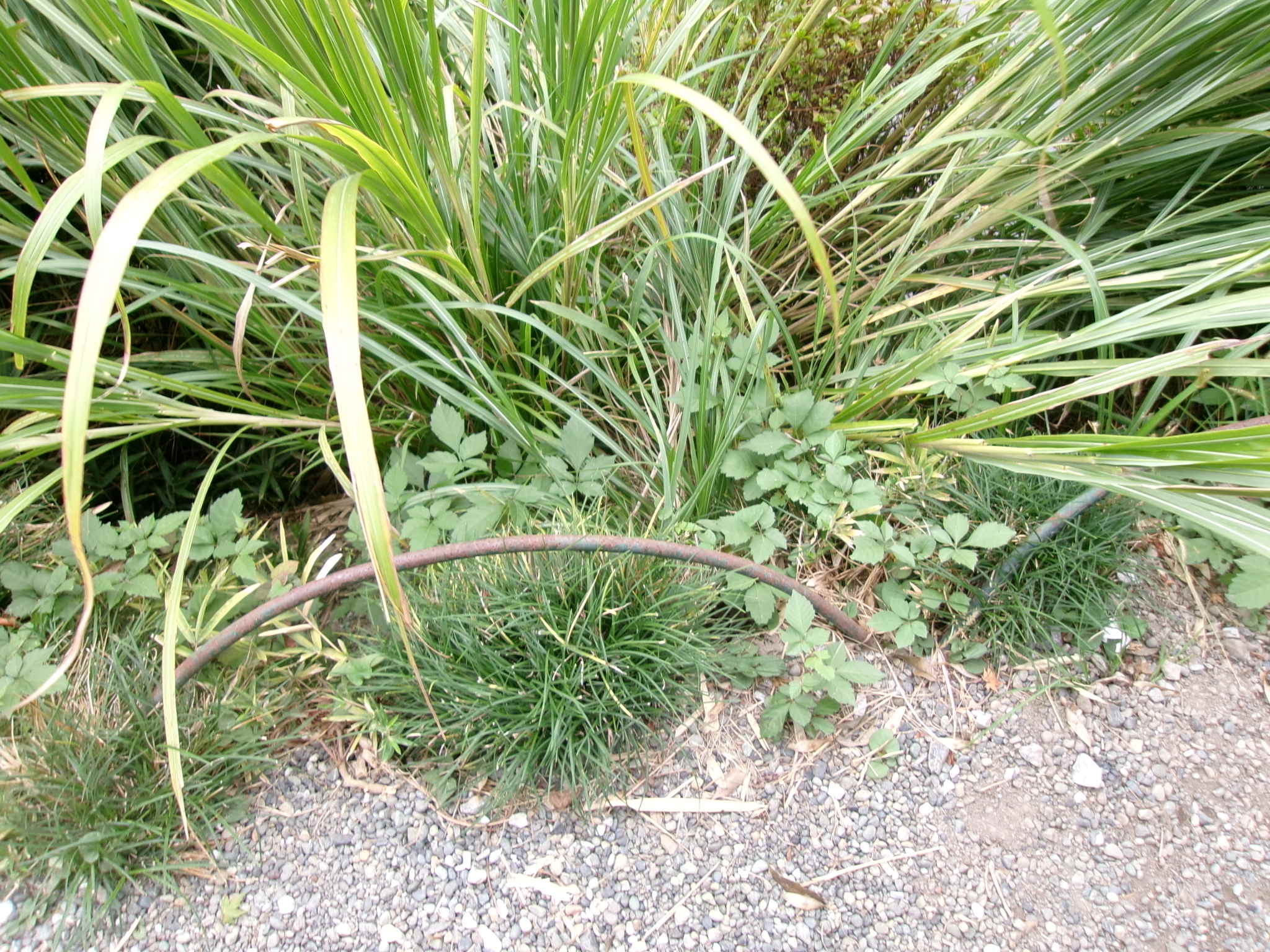 波柵に沿って植え込まれている龍の髭にヤブガラシが巻き付いている