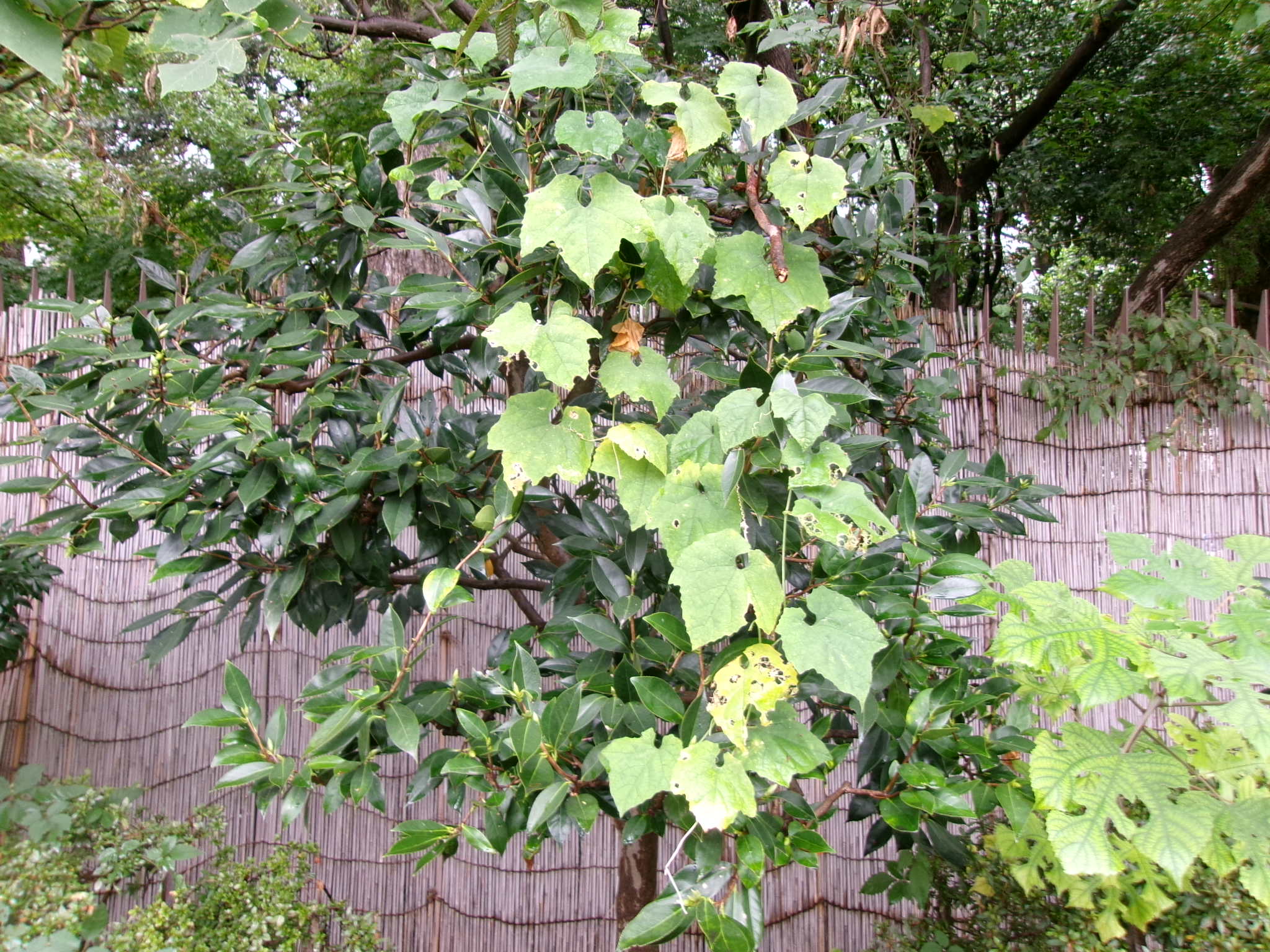 ツバキにツタ類が絡まっている