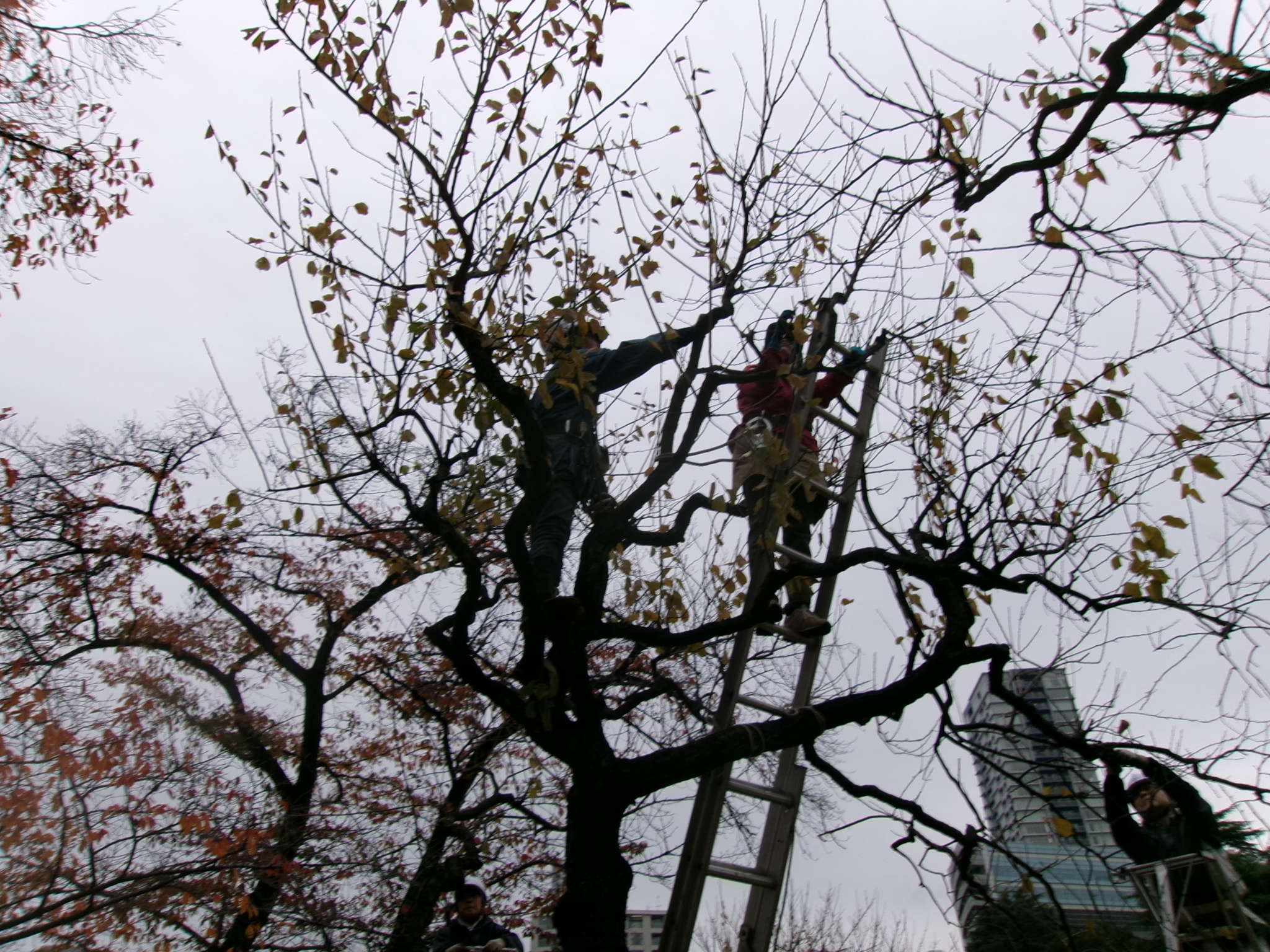 先輩方が率先して脚立に登り高所の剪定をしてくれる